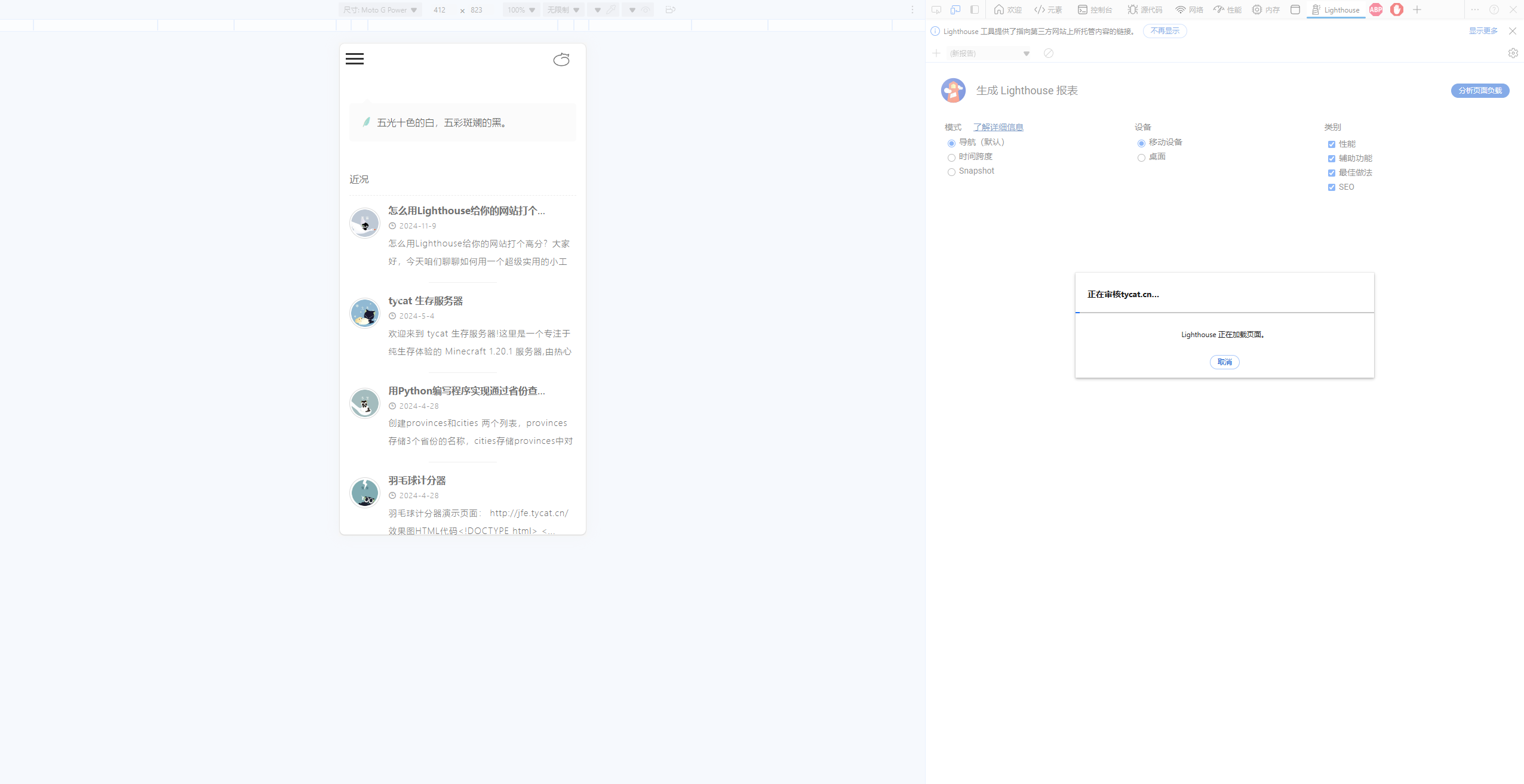 开始生成报告:点击“生成报告”按钮后,Lighthouse会开始对当前页面进行全面分析。这个过程可能需要几分钟时间,具体取决于网页的复杂程度。